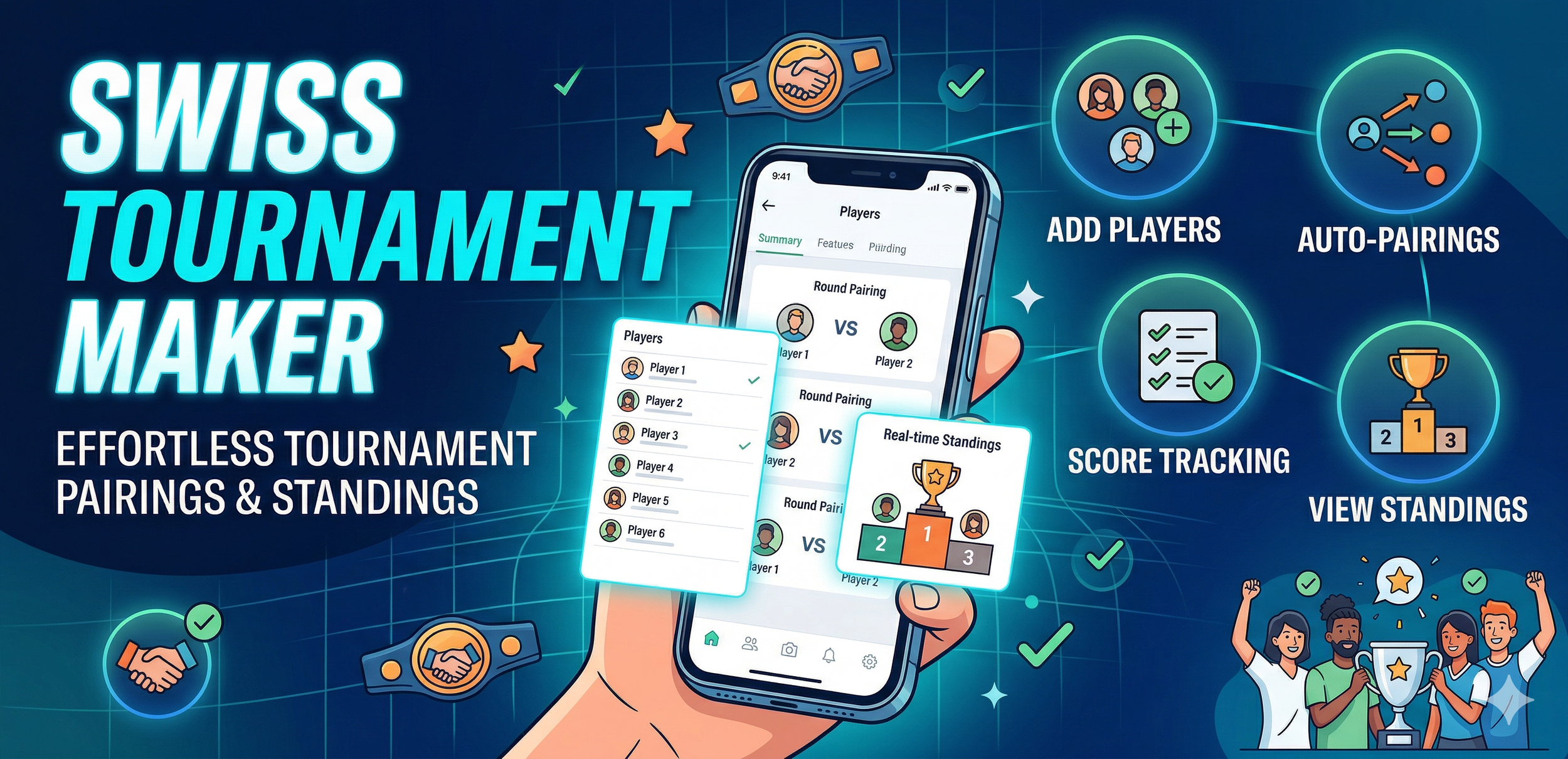Manage and track competitive events with ease. Swiss Rounds Tournament Maker is an application designed to handle pairings and standings for Swiss-system tournaments such as Magic The Gathering. Eliminate the complexity of manual brackets and ensure fair, non-elimination matchups for your local competitions and game nights.